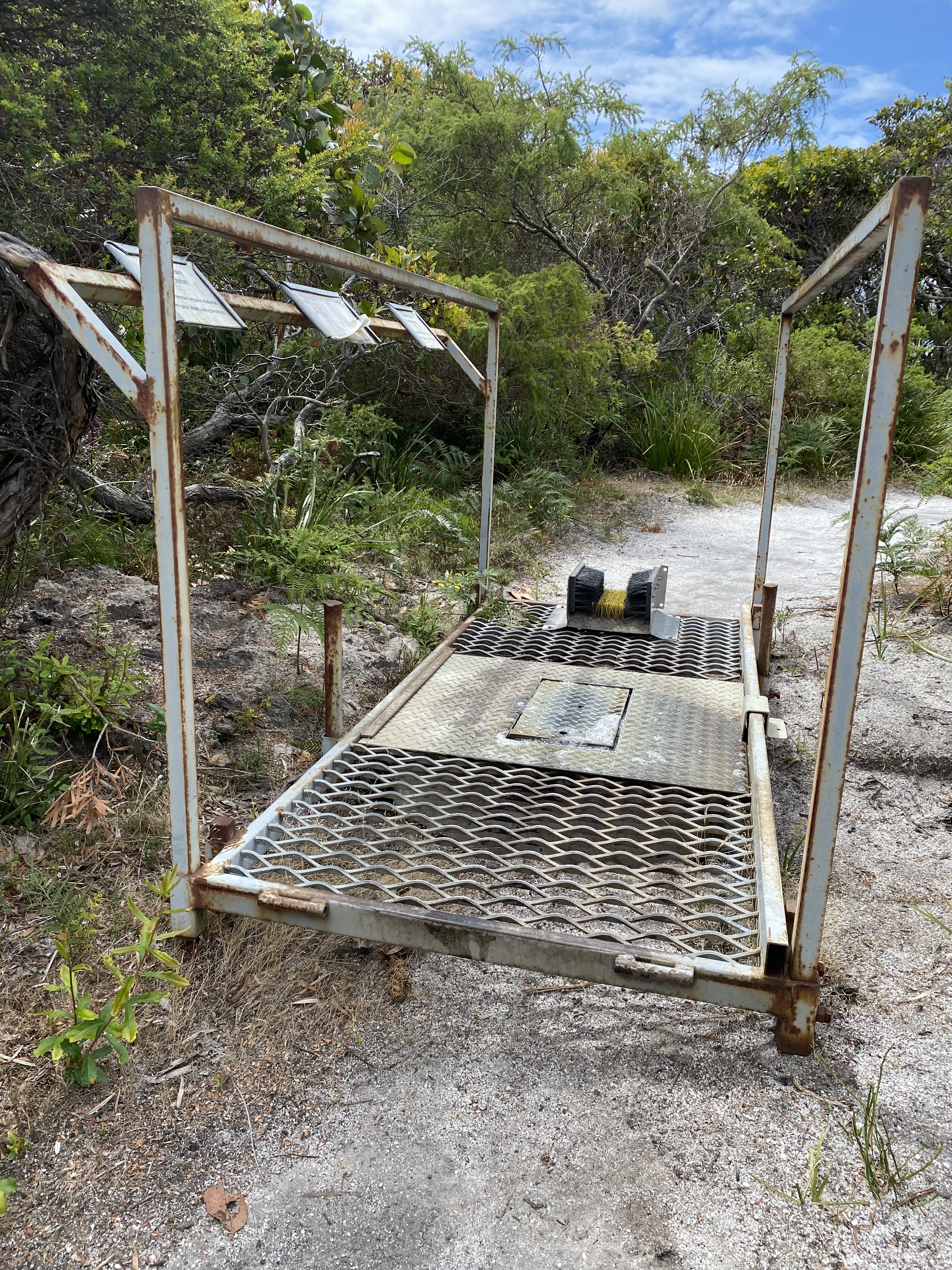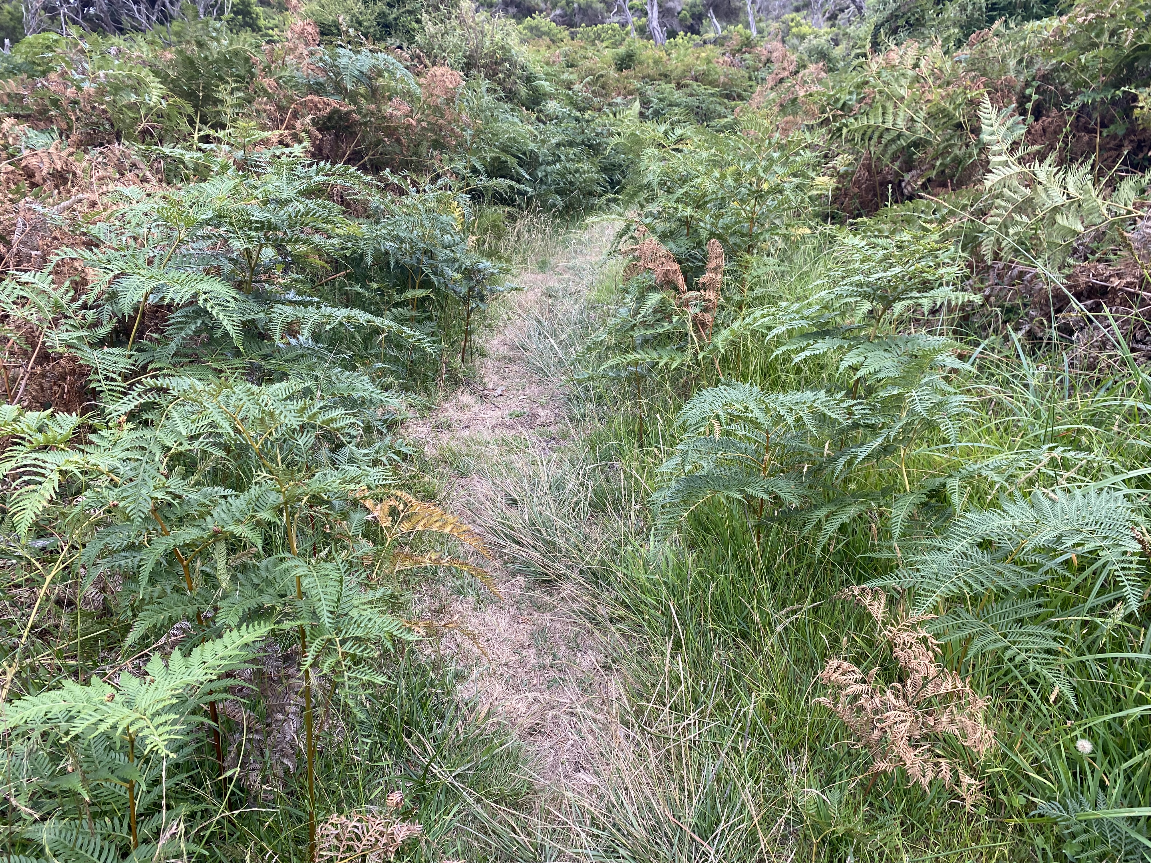 I identified the trail marker from the beach back to the inland route pretty easily. The formal path started in a deep ravine through the sand dunes. Getting onto it required a very high initial step-up (possibly 75cm). There was a rope to help, but by that stage, I hadn’t been able to avoid removing my boots to wade through another inlet nearby, and it was a massive kerfuffle to try to get boots on, pack off, and climb up this very steep ravine and then get my pack back on.