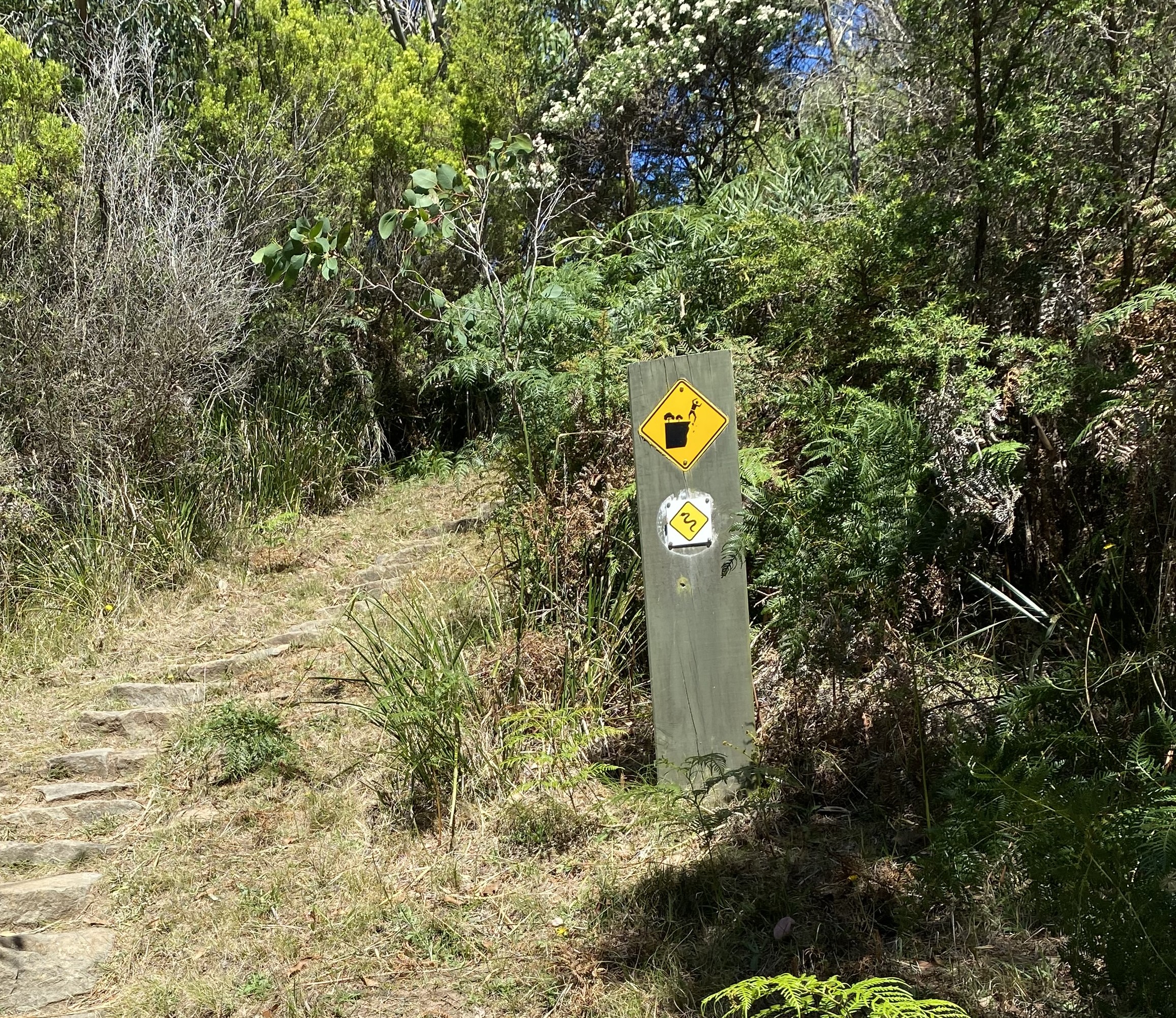 The track was wide and sandy, and there were many places to stop and rest and take photos. The cliff-top views were spectacular. The little nooks and crannies made by the resident wallabies and kangaroos in the bushes were a curious distraction, and I met quite a few animals along the way.