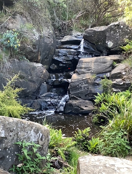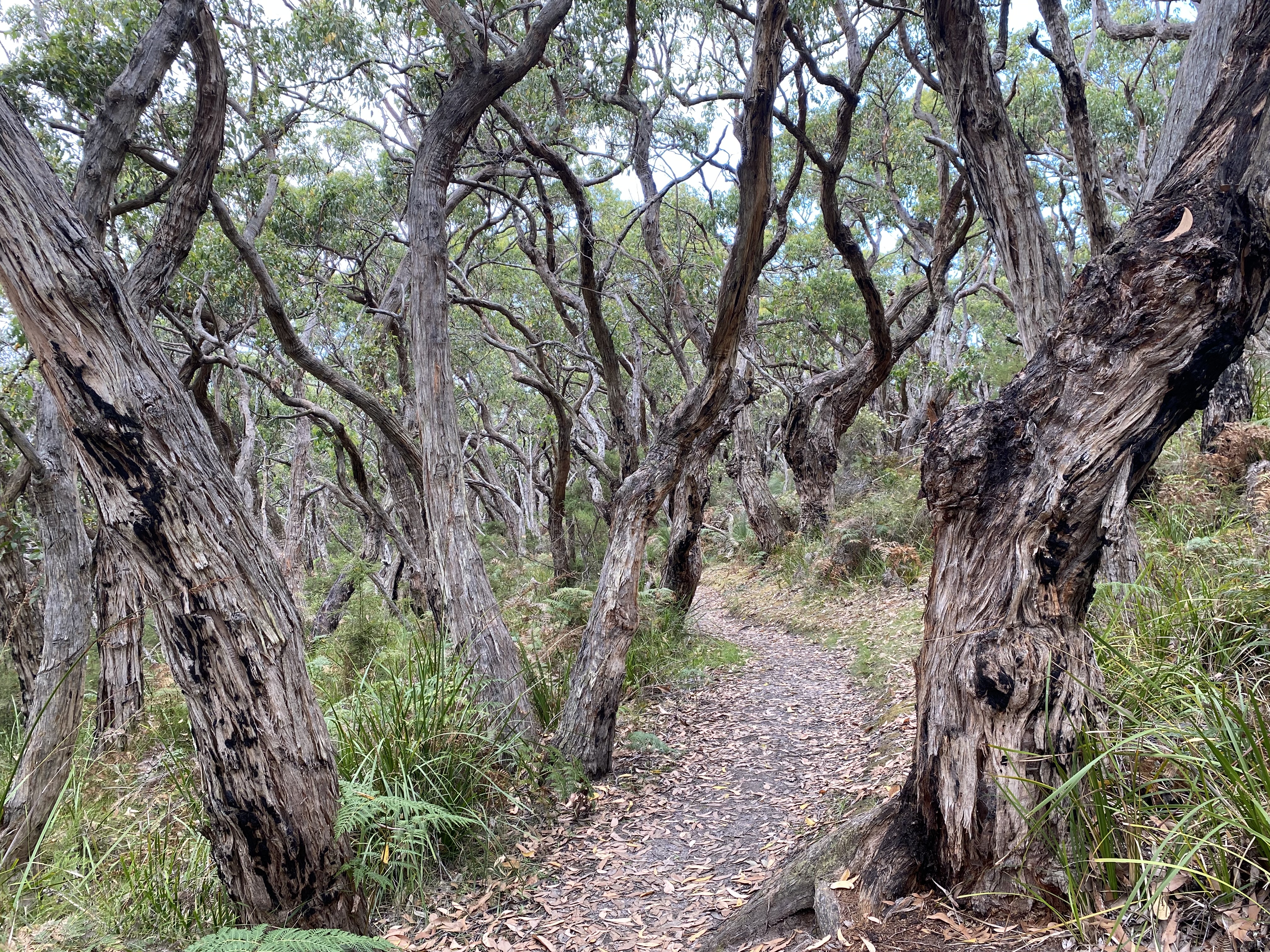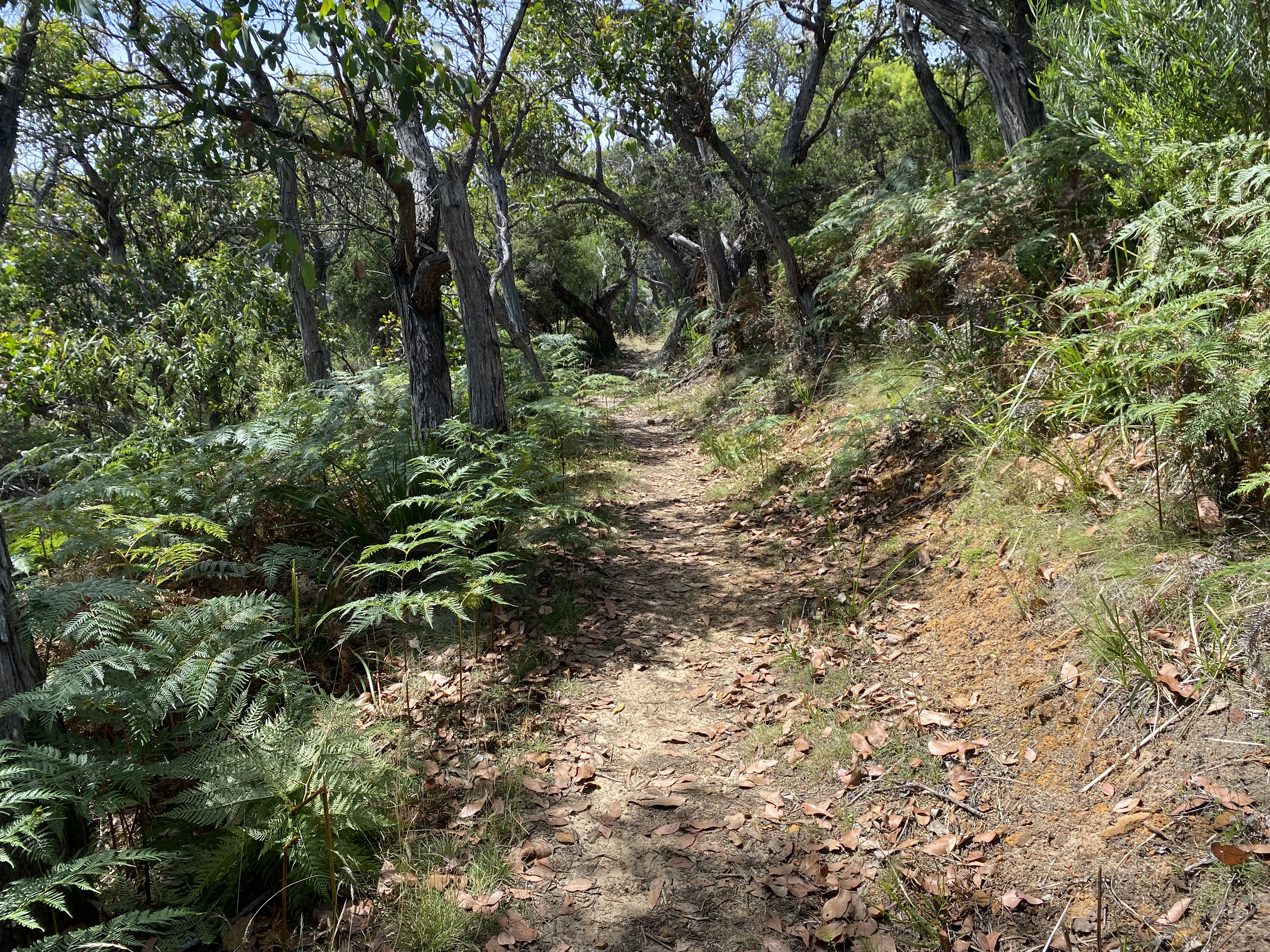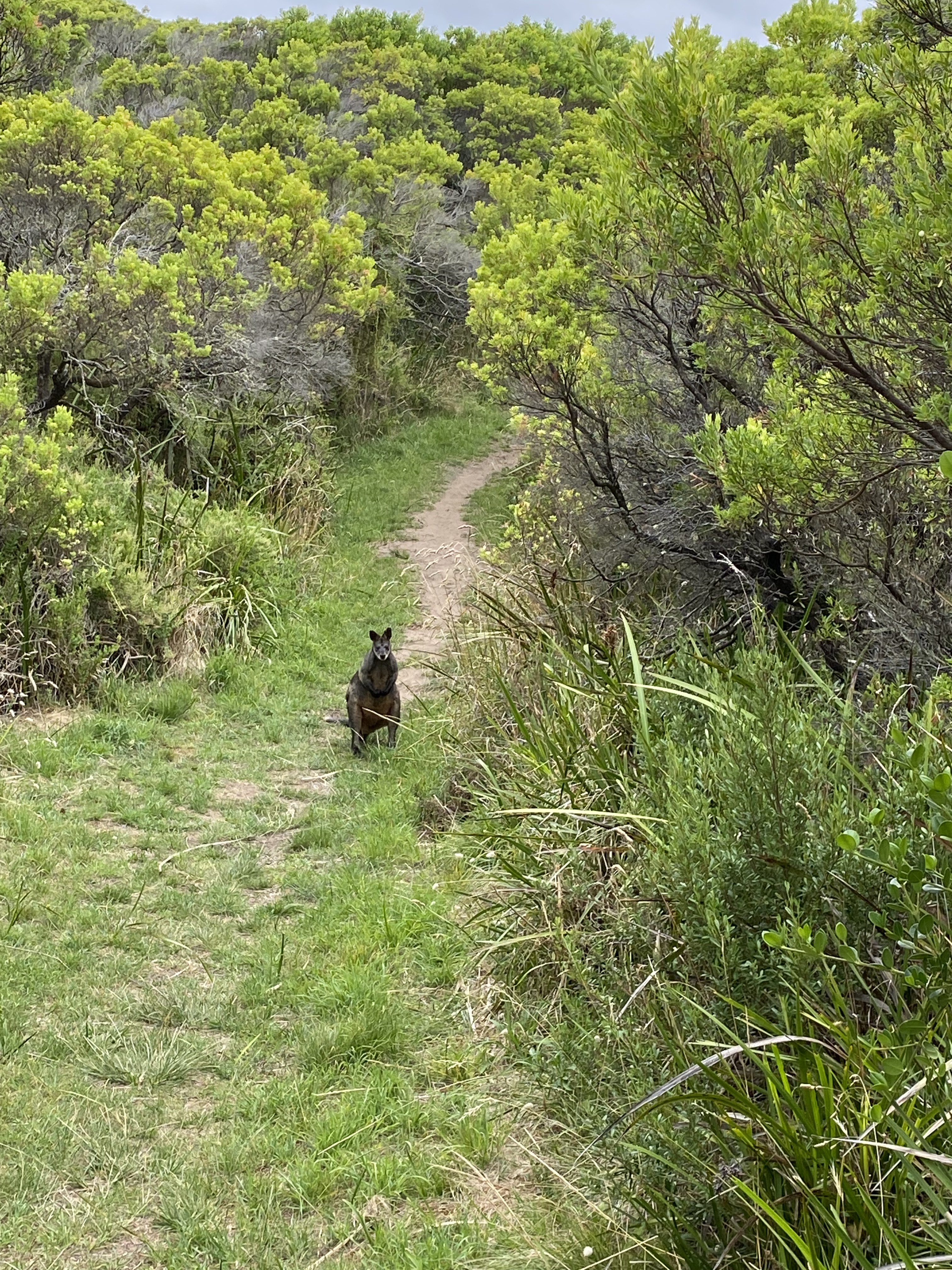I was paying very close attention to the likelihood of snakes. I knew that they would be hard to spot in the bushes and grass alongside the narrow paths. Luckily I’d been paying attention, since, at about midday, I spotted a rather large black/grey and white striped snake a little further up the path. I assumed it was a tiger snake since I knew they lived in these southern parts of Australia. It did not look happy to see me and it was very much aware of my presence. I suspect it was smelling (tasting) my fear on its tongue that was darting in and out. I did, what any good city slicker would do, and brought out my phone to take a photo and video. I finally started to stomp my feet and clap my hands, till it did what I’d hoped it would do, and slid off into the bushes.