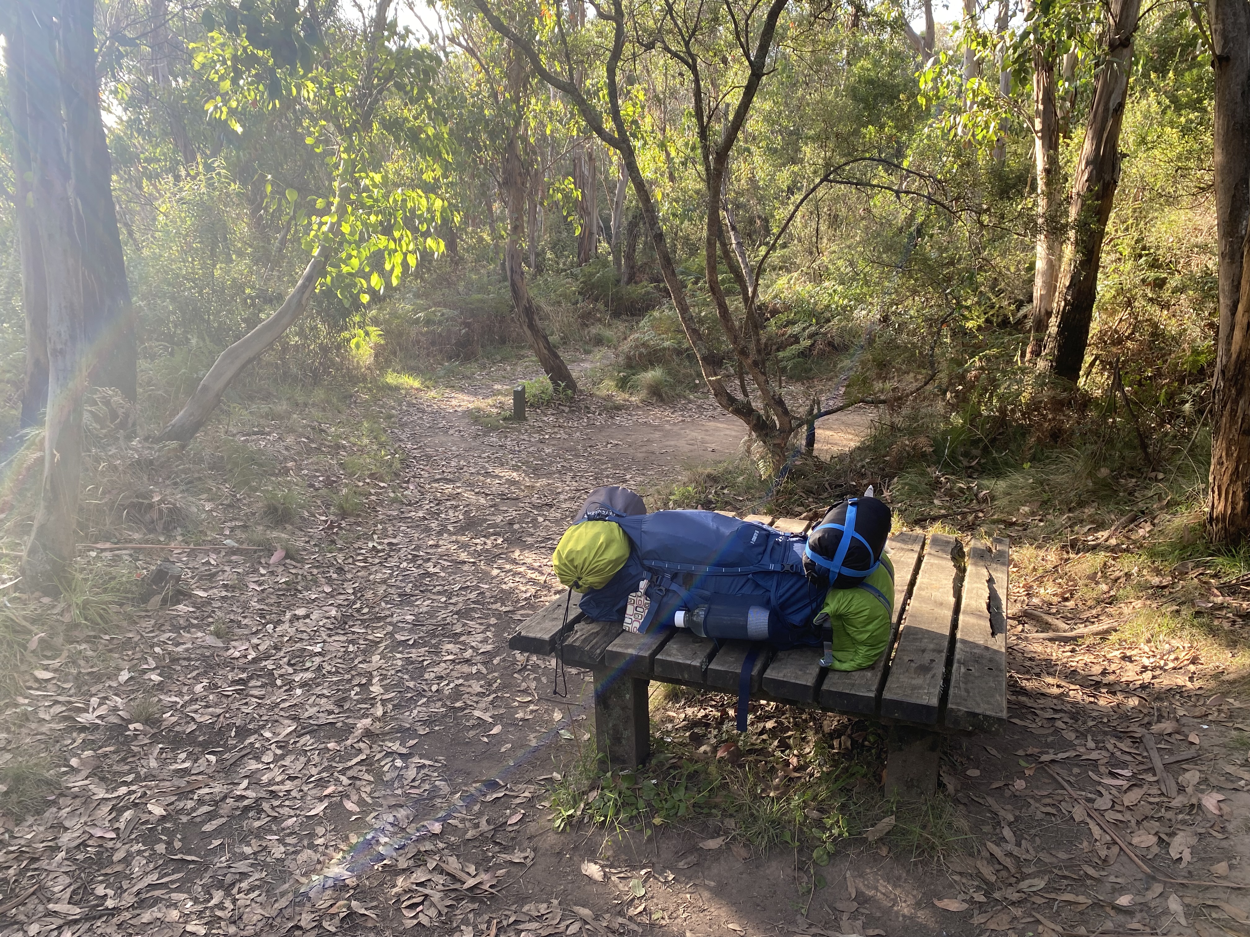 I kept walking and saw more kangaroos and wallabies that day than all the other days combined. The track spat me out onto a shared road with cars, though I didn’t see a single car. There were no good places for me to stop, and after I’d walked 4km without a drink, I decided that I needed to test out my ‘getting up’ abilities again because it was very hot and I was surely getting dehydrated by that stage. I sat by the side of the road and, of course, I managed to get back up again. My pack was becoming almost manageable.