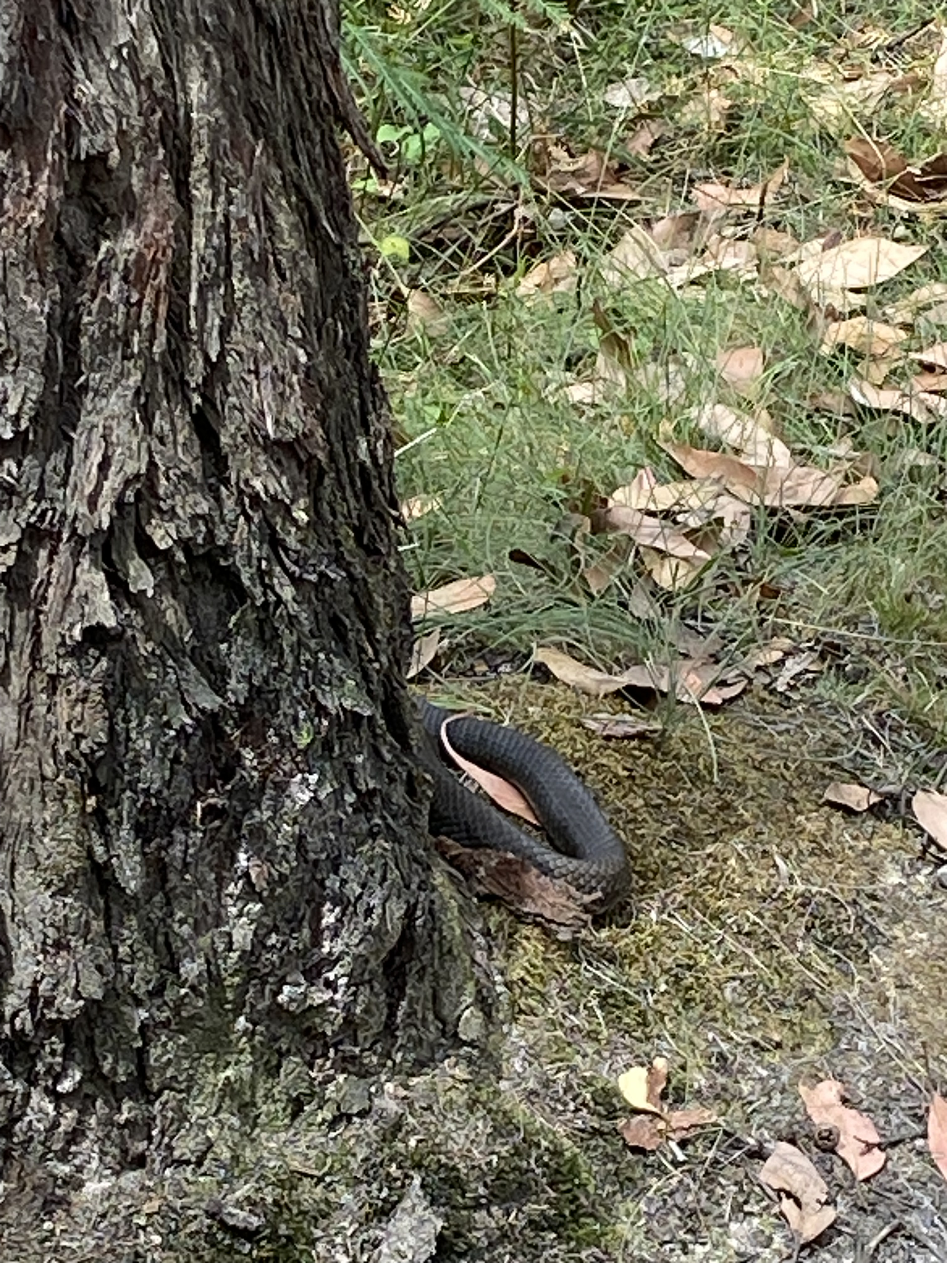 No less than 3 minutes later (I am not exaggerating) a heavy snake fell onto my left boot. I jumped backward for that one. It must have been sitting in a tree and I’d given it a fright as I neared it. It was black (no idea what sort) and was also not happy with me. I couldn’t get it to move off the path, so I eventually had no choice but to walk past it.