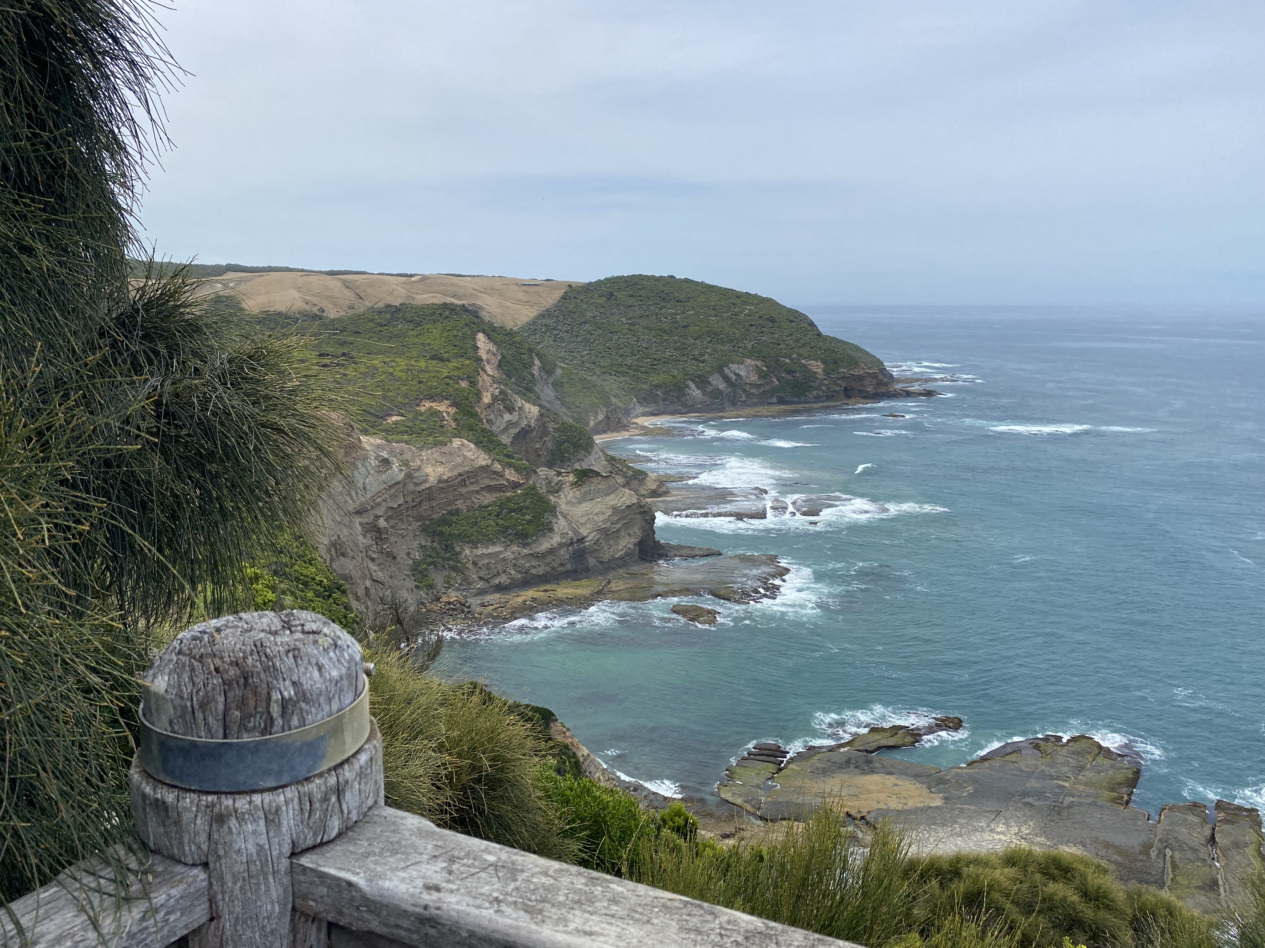 It was such a lovely walk. The path mostly meandered along the cliff top in coastal scrub. There were many intended viewpoints but the shrubs were quite high so it was hard to see over them. I did though, jump up onto any benches I came across and was finally rewarded with a single Apostle poking its head above a bluff. I was getting nearer my destination.